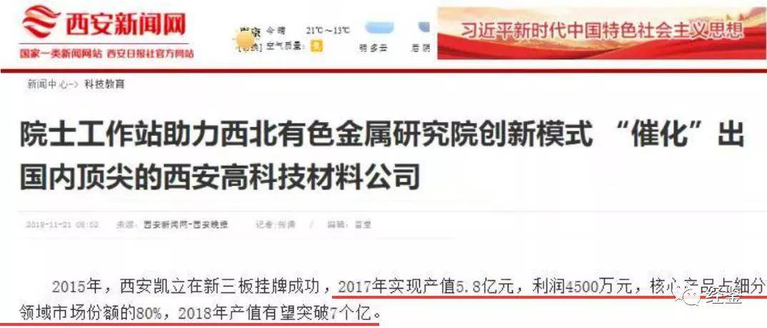 但经鉴上市公司课题研究组发现,在2018年11月21日《西安晚报》的宣传文章《院士工作站助力西北有色金属研究院创新模式,“催化”出国内顶尖的西安高科技材料公司》的报道中称,2015年,西安凯立在新三板挂牌成功,2017年实现产值5.8亿元,利润4500万元,核心产品占细分领域市场份额的80%,2018年产值有望突破7个亿。