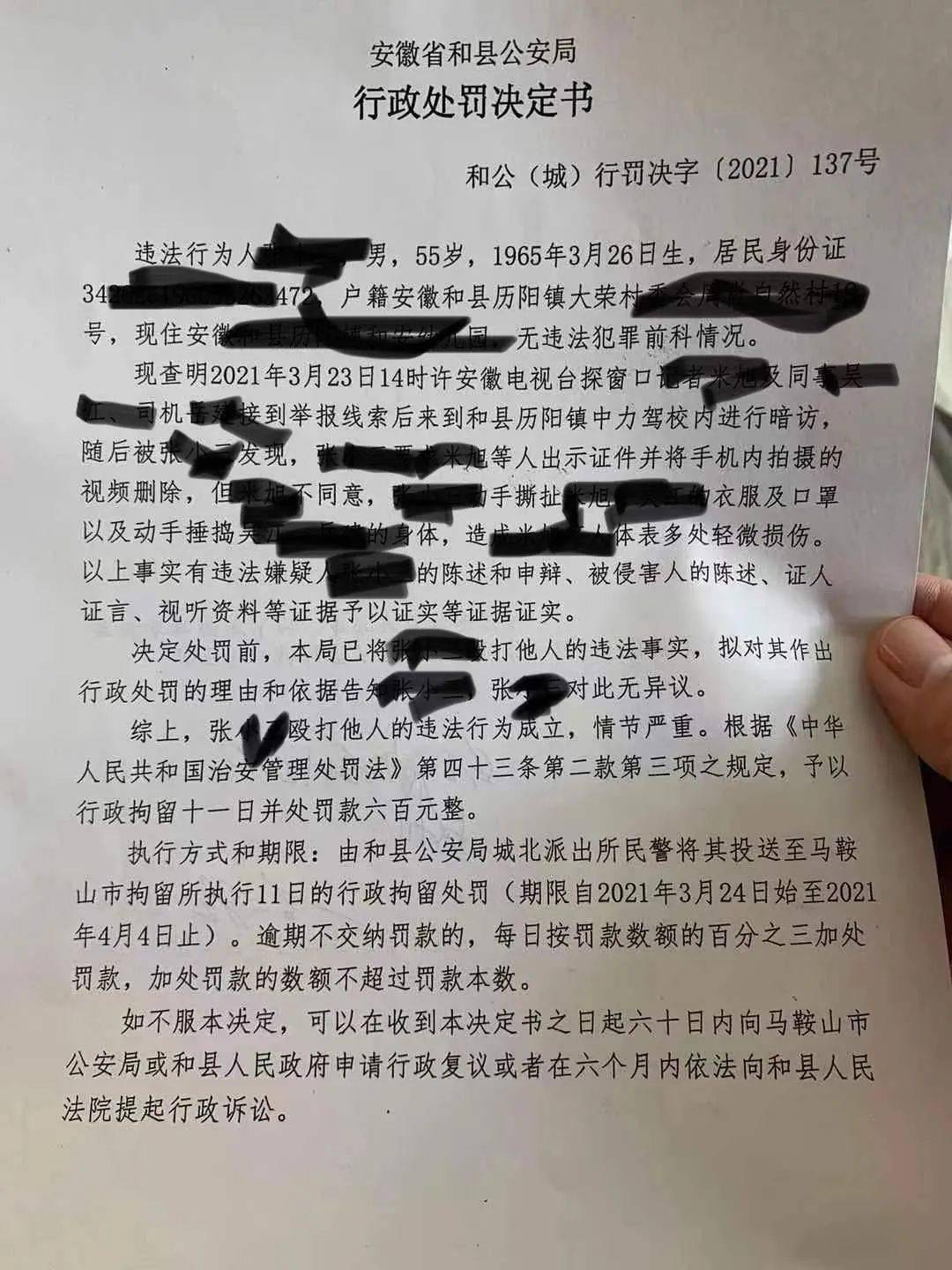据通报,2021年3月23日,安徽电视台公共频道“探窗口”记者根据群众举报,前往和县洁福康餐具清洗配送部进行暗访报道,期间发生记者被打事件。封面新闻记者获得的一份安徽省和县公安局对该事件出具的处罚决定书显示,安徽电视台两名记者和一名司机在暗访时被张小三发现,张小三在要求暗访记者删除手机内拍摄的素材过程中,动手撕扯记者衣物,以及动手锤捣记者身体,造成多人体表多处轻微损伤。
