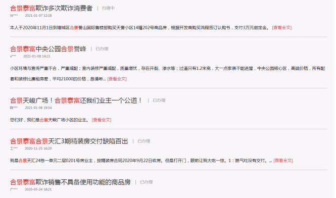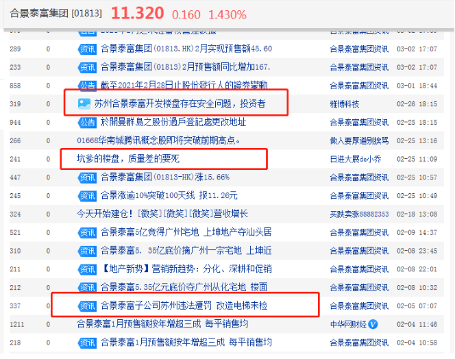 消费者反映合景泰富问题的渠道还不仅仅只有人民网,包括股吧等网络空间,也出现了各种吐槽的帖子。