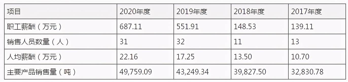 发现网注意到,鑫甬生物的销售人员薪酬也随着销售费用而水涨船高,2017-2020年,公司销售人员数量分别为13人、11人、32人和31人,人均薪酬高达10.70万元、13.50万元、17.25万元和22.16万元。