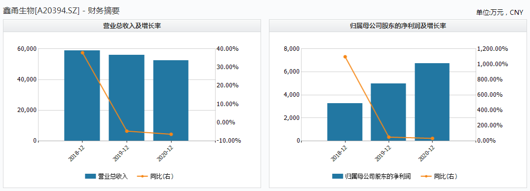然而近年来,鑫甬生物的营业收入却在不断下滑。2018-2020年,鑫甬生物的营业收入分别为5.88亿元、5.61亿元和5.26亿元,同比增长率分别为37.92%、-4.60%和-6.30%;同期归母净利润分别为3279.83万元、4977.41万元和6731.63万元,同比增长率分别为1097.38%、51.76%和35.24%,不论是营业收入还是归母净利润,鑫甬生物的增速都处在下滑趋势。