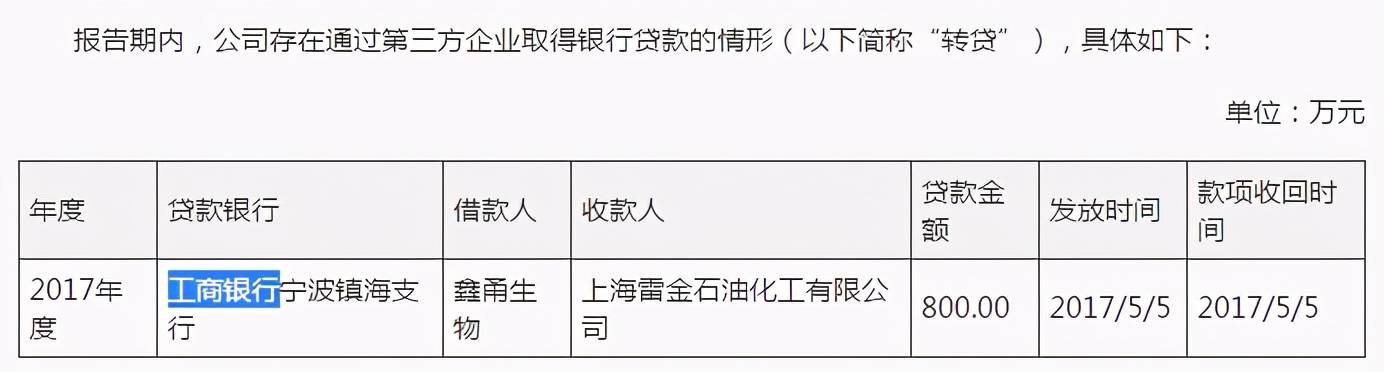 然而,转贷行为却并没有就此断绝。2017年,鑫甬生物通过第三方上海雷金石油化工有限公司向工商银行宁波镇海支行贷款800万元。