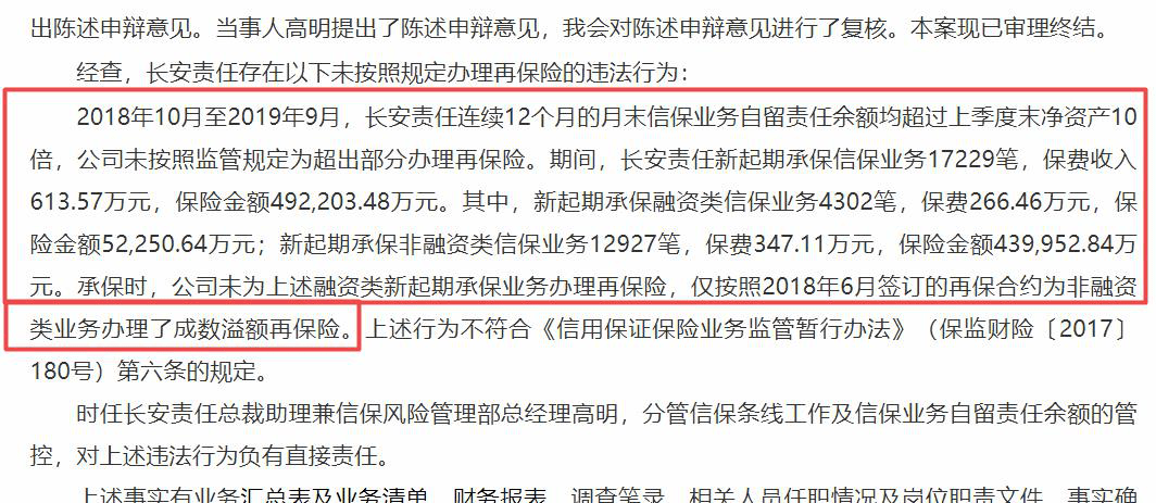 银保监会官网显示,2018年10月至2019年9月,长安责任连续12个月的月末信保业务自留责任余额均超过上季度末净资产10倍,公司未按照监管规定为超出部分办理再保险。期间,长安责任新起期承保信保业务17229笔,保费收入613.57万元,保险金额49.22亿元。其中,新起期承保融资类信保业务4302笔,保费266.46万元,保险金额5.23亿元;新起期承保非融资类信保业务12927笔,保费347.11万元,保险金额43.99亿元。承保时,公司未为上述融资类新起期承保业务办理再保险,仅按照2018年6月签订的再保合约为非融资类业务办理了成数溢额再保险。