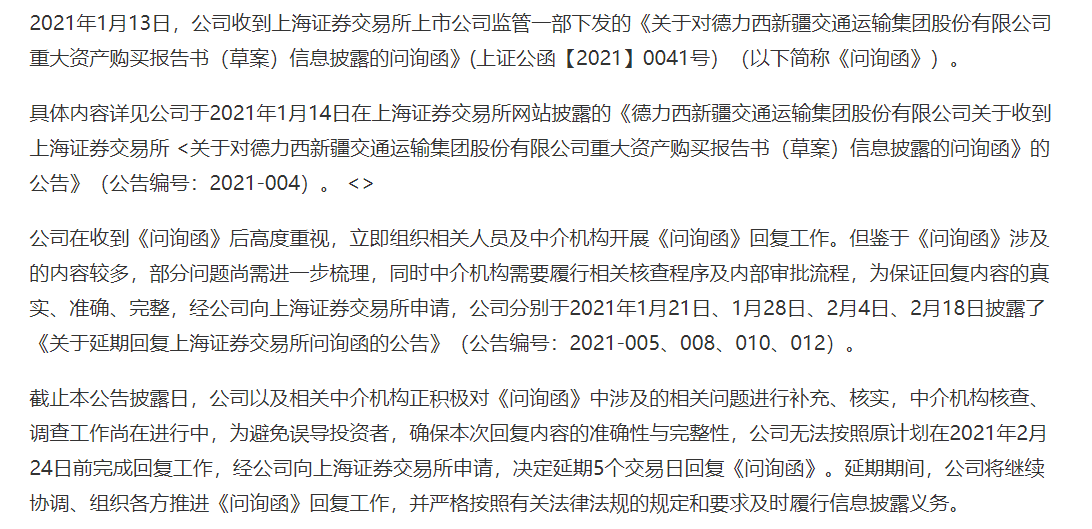 鉴于《问询函》涉及的内容较多,德新交运分别于2021年1月21日、1月28日、2月4日、2月18日披露了《关于延期回复上海证券交易所问询函的公告》,直至2月26日才对此进行回复。