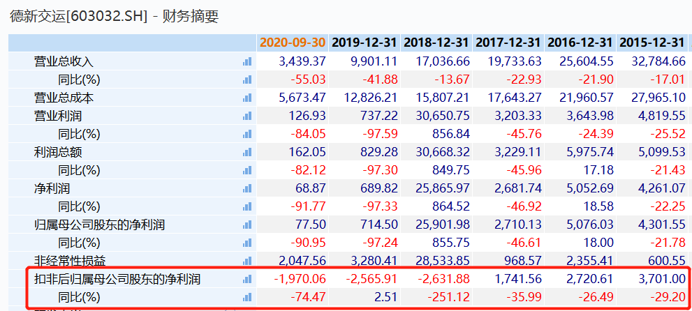同时,跟踪数据发现,德新交运扣非后归属母公司股东的净利润已连续三年亏损,且从2015年开始该数据就逐年下降。Wind数据显示,2018年-2019年及2020年前三季度德新交运扣非后归母净利润分别为-2631.88万元、-2565.91万元和-1970.06万元,同比增速-251.012%、2.51%和-74.47%;2015年-2017年情况分别为3701万元、2720.61万元和1741.56万元,同比下降29.20%、26.49%和35.99%。