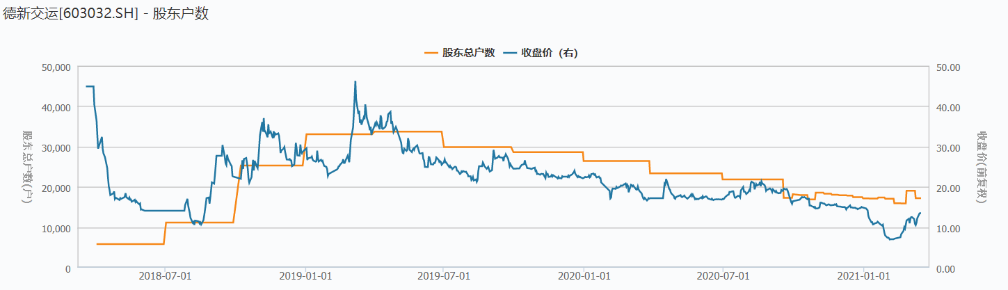 3月15日,德新交运在某互动平台上发布消息称,截至2021年3月10日公司股东户数为1.72万户。Wind数据显示,一年多以来,德新交运的股东总户数及股价整体呈现下降的态势,股东总户数最高时达3.37万户。据了解,截至2021年A股上市公司平均股东户数为4.86万户。