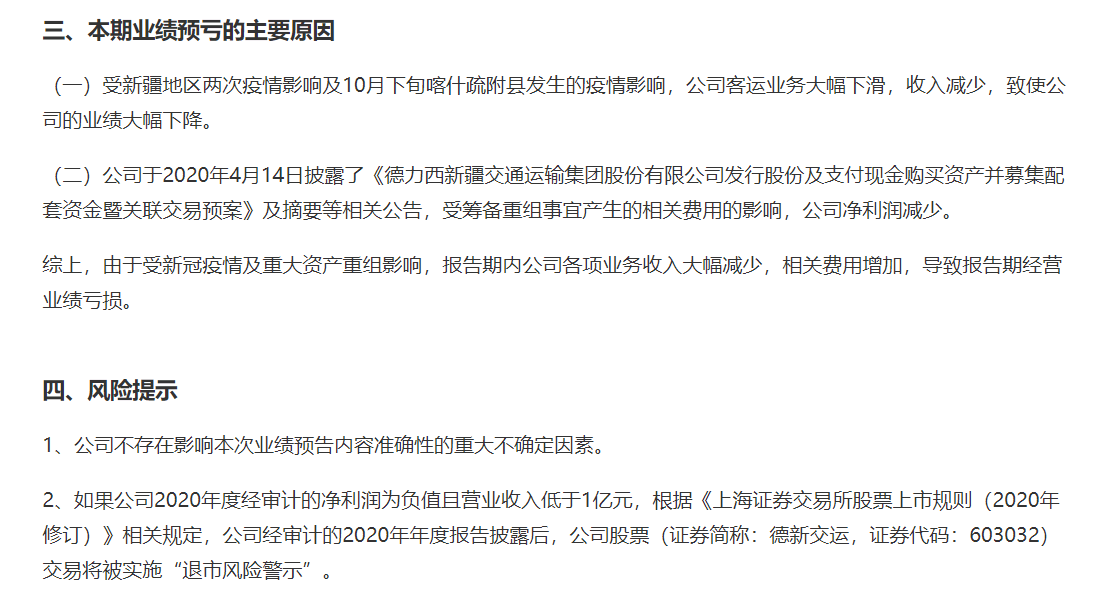 业绩预告发布当日,德新交运便发布公司股票可能被实施退市风险警示的风险提示公告,如果公司2020年度经审计的净利润为负值且营业收入低于1亿元,根据相关规定,公司经审计的2020年年度报告披露后,公司股票交易将被实施“退市风险警示”。