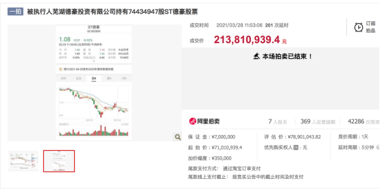 3月28日,记者从阿里拍卖获悉,芜湖德豪投资有限公司持有7443.49万股ST德豪股票在阿里拍卖平台通过网络拍卖成交,成交总价2.14亿元。