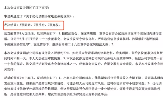 而值得一提的是,ST德豪董事会以5票同意,2票反对,2票弃权审议通过了《关于优化调整小家电业务的议案》,公司多名董事对《关于优化调整小家电业务的议案》提出异议,表示议案发送时间短,议案材料不够充分,无法判断该议案对公司的影响和相关风险。
