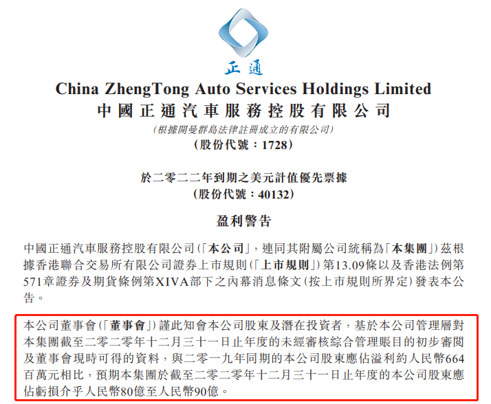 3月28日晚间,正通汽车(01728.HK)发布盈利警告,预计2020年亏损为80亿元-90亿元。