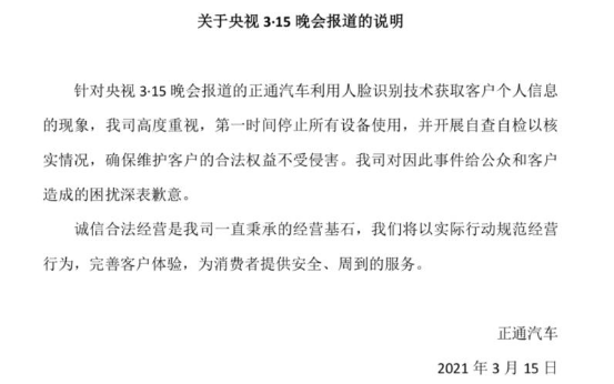 事件曝光后,正通汽车做出回应,称已停止所有设备使用。“针对央视315晚会报道的正通汽车利用人脸识别技术获取客户个人信息的现象,我司高度重视,第一时间停止所有设备使用,并开展自查自验以核实情况,确保维护客户的合法权益不受侵害。我司对因此时间给公众和客户造成的困扰深表歉意。”公司表示。