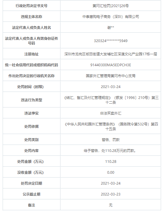 中泰惠购电子商务公司违法遭罚110万 非法买卖外汇