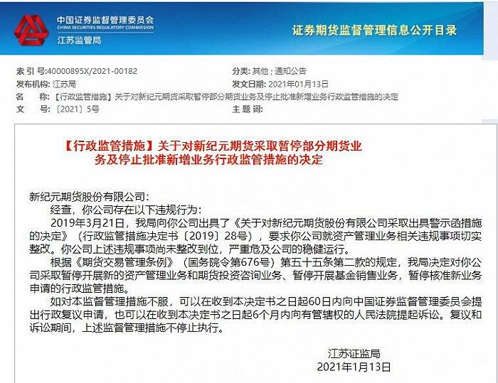 2021年1月,江苏证监局发布的一则行政监管措施决定书,新纪元期货因相关违规被处以暂停三项业务的重罚。