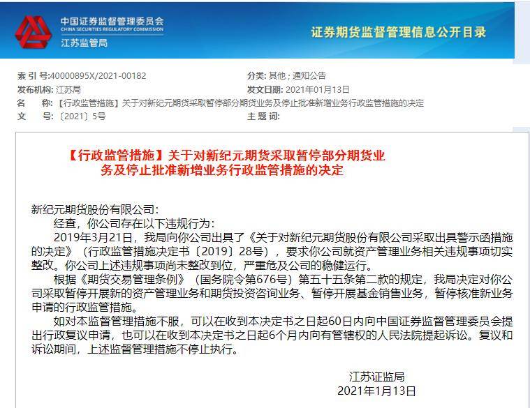 因此根据《期货交易管理条例》(国务院令第676号)第五十五条第二款的规定,江苏证监局决定对新纪元期货采取暂停开展新的资产管理业务和期货投资咨询业务、暂停开展基金销售业务,暂停核准新业务申请的行政监管措施。