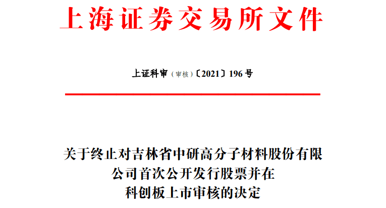 2021年3月25日,中研股份和保荐人安信证券股份有限公司向上交所提交了《吉林省中研高分子材料股份有限公司关于撤回首次公开发行股票并在科创板上市申请文件的申请》和《安信证券股份有限公司关于撤回吉林省中研高分子材料股份有限公司首次公开发行股票并在科创板上市申请文件的申请》,申请撤回申请文件。根据《上海证券交易所科创板股票发行上市审核规则》第六十七条的有关规定,上交所决定终止对中研股份首次公开发行股票并在科创板上市的审核。