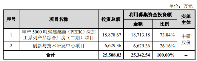 中研股份原拟在上交所科创板公开发行股票数量不超过3042万股,占公司发行后总股本的比例不低于25%,拟募集资金2.53亿元,其中1.87亿元年产5000吨聚醚醚酮(PEEK)深加工系列产品综合厂房(二期)项目,6629.36万元用于创新与技术研发中心项目。