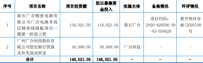 广合科技原拟在上交所科创板公开发行股票数量不超过1亿股(不含釆用超额配售选择权发行的股票数量),且不低于本次发行完成后股份总数的10%,拟募集资金14.60亿元,其中11.60亿元用于黄石广合精密电路有限公司广合电路多高层精密线路板项目一期第一阶段工程,3亿元用于广州广合科技股份有限公司偿还银行贷款及补充流动资金。