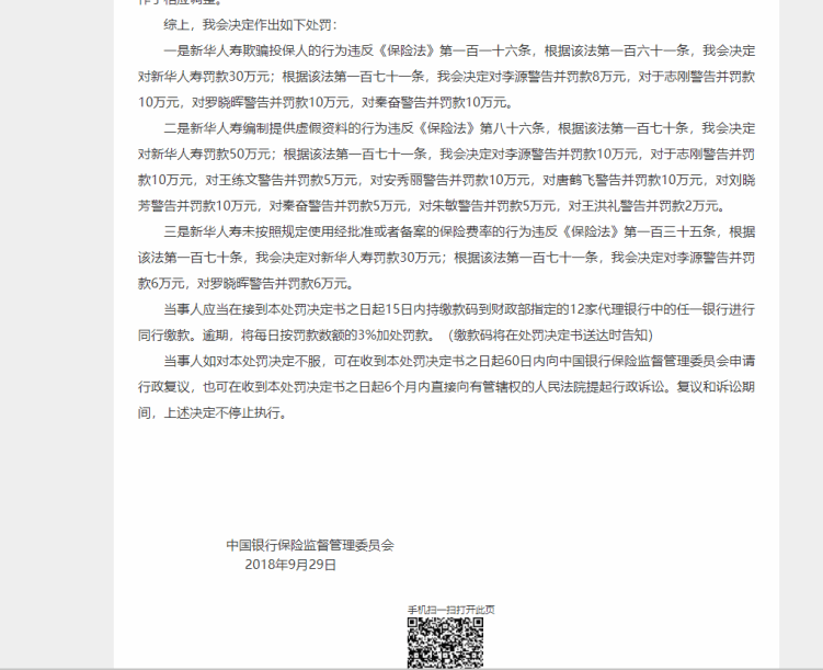 《银保监保罚决字〔2018〕1号》显示,新华保险存在欺骗投保人、编制提供虚假资料、未按照规定使用经批准或者备案的保险费率的行为。