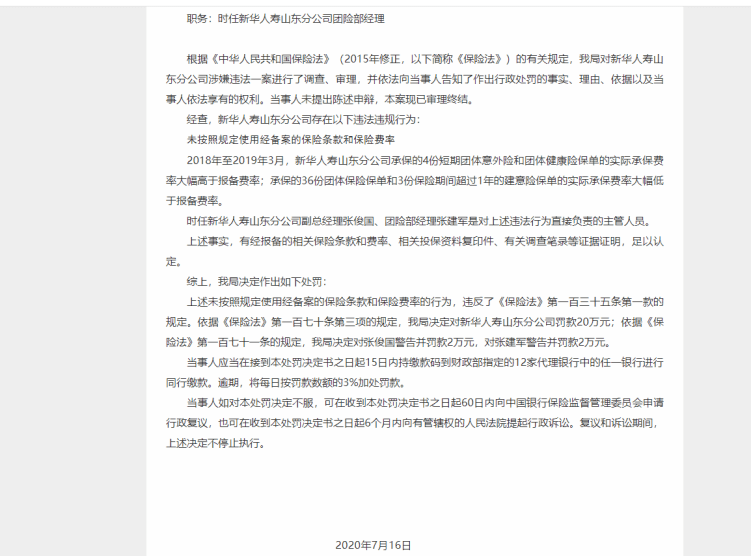 根据中国银保监会网站2020年7月16日发布的信息,经查,新华保险山东分公司存在未按照规定使用经备案的保险条款和保险费率的违法违规行为。