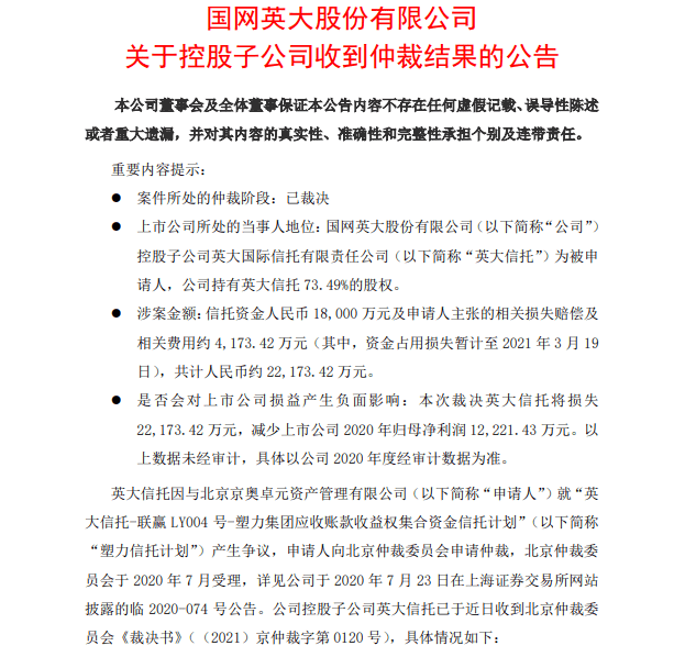 国网英大在公告中表示,本次仲裁为终局裁决,英大信托对裁决结果无异议。但因为本次裁决英大信托将损失2.22亿元,相应地将减少上市公司2020年归母净利润1.22亿元。英大信托将继续寻求可能的救济措施,包括但不限于另行主张权利,尽全力维护公司及全体股东的合法权益。