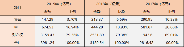英大信托的财产权信托按信托标的主要包括接受以电费收费权、应收债权设立的财产权信托和以银行信贷资产为标的设立的信托业务。据年报显示,这一指标占英大信托的信托资产比例已从2017年的69.01%升至2019年的79.36%。