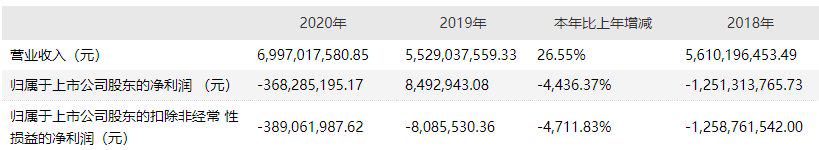 值得注意的是,2020年,该公司归属于上市公司股东的净利润亏损3.68亿元,相较2019年的849万元,同比下降4436.37%。而扣除非经常性损益后的归属于母公司的净利润自2018年起更是持续三年亏损。2018年—2020年三年间,该项指标分别为-12.59亿元、-0.08亿元和-3.89亿元。