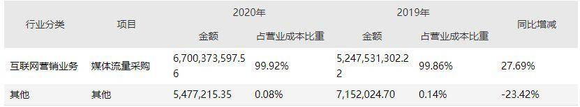 《投资时报》研究员注意到,从成本端来看,佳云科技营业成本结构非常单一,占据绝大头的是媒体流量采购一项,2020年该项成本为67亿元,占互联网营销业务营业成本比重为99.92%。而2019年该指标为52.48亿元,占营业成本比重达99.86%。