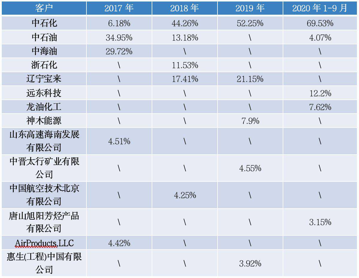 尤其需要注意的是,在报告期各期前五大客户中,来自中石化的销售收入占比逐年攀升,2019年及2020年1—9月分别达到52.25%及69.53%。