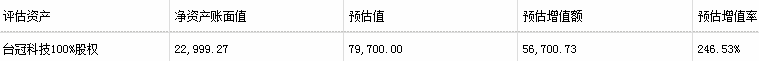 本次交易募集配套资金不超过4.00亿元,用于支付本次交易现金对价、支付交易费用及中介机构费用,以及补充标的公司流动资金。本次交易台冠科技100%股权的预估基准日为2018年8月31日。截至预估基准日,标的资产净资产账面值、预估值及交易各方初步协商定价情况如下: