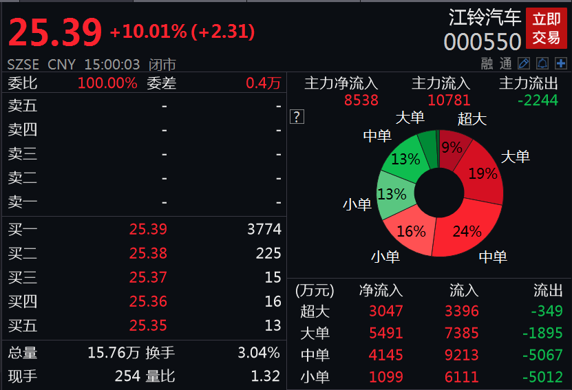 3月29日,江铃汽车盘中股价不断拉升,涨幅达10%,报25.39元/股。