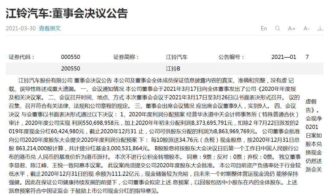 也就是说,江铃汽车在2020年实现净利润5.5亿的情况下,却欲给投资者分红30个亿。