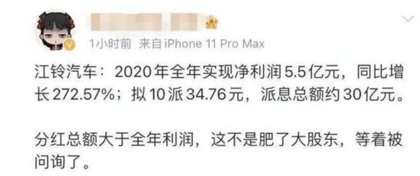 所以这才有了网友对江铃汽车豪气分红的担忧。