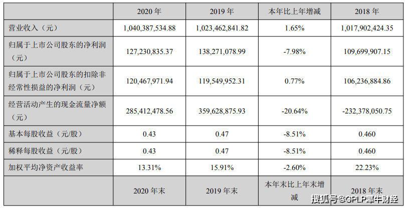 3月24日,兴瑞科技(002937.SZ)发布2020年报称,实现营收10.40亿元,同比增1.65%;实现净利润1.27亿元,同比降7.98%。