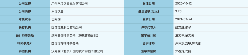 广州禾信仪器股份有限公司是一家主要从事质谱仪的研发、生产和销售,并向客户提供质谱仪及相关技术服务的公司。值得注意的是,禾信仪器终止近10个月后科创板之路后再次申报,其科创板IPO申请已于2020年10月12日再次获受理,将于2021年3月31日通过上市委审议,此次保荐机构为国信证券·保荐人魏安胜,张华。
