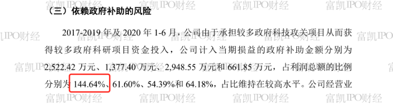 在此次最新招股书中,也能看出一些端倪。在依赖政府补助的风险提示中称,2017-2019年及 2020 年1-6月,公司计入当期损益的政府补助金额分别为2522.4万元、1377.4万元、2948.6万元和 661.9万元,占利润总额的比例分别为 144.6%、61.6%、54.4%和64.2%,占比维持在较高水平。公司也称,公司经营业绩对政府补助存在依赖,如未来公司无法持续承担或参与政府科技攻关项目导致政府科研项目资金投入缩减甚至取消,将对公司盈利能力产生不利影响。