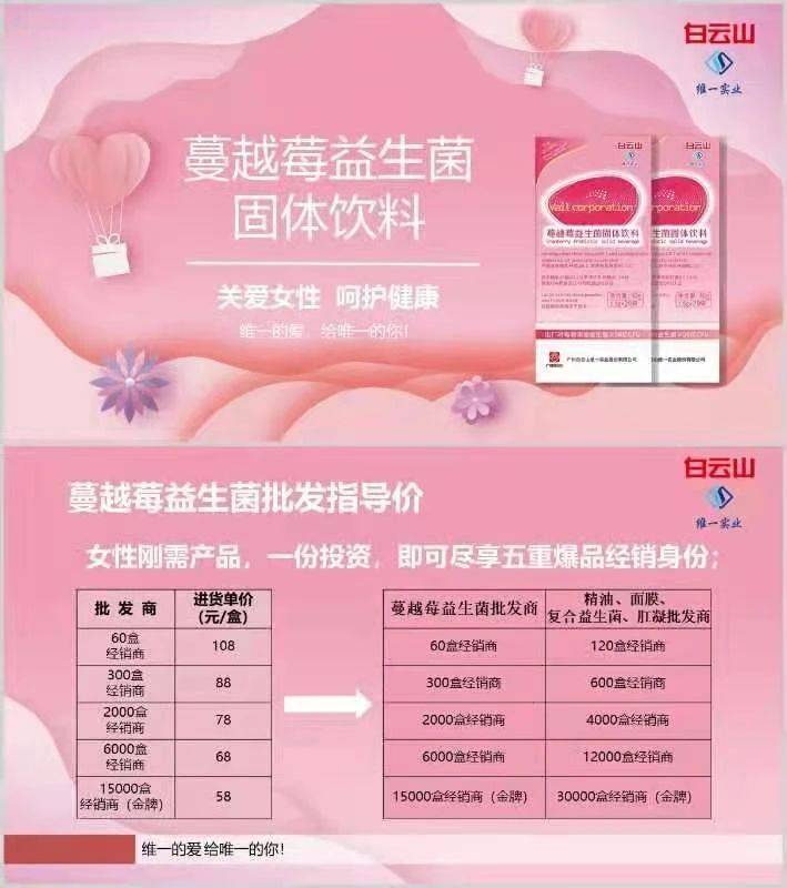 《投资者网》以消费者身份接触一位蔓越莓益生菌固体饮料的经销商小陈,对方表示该产品是白云山维一实业今年刚上市的新品,具有美容养颜、增强免疫力、防治妇科炎症、改善泌尿系统环境等多重功效,并称“产品在上市前已经有了很多临床案例。”