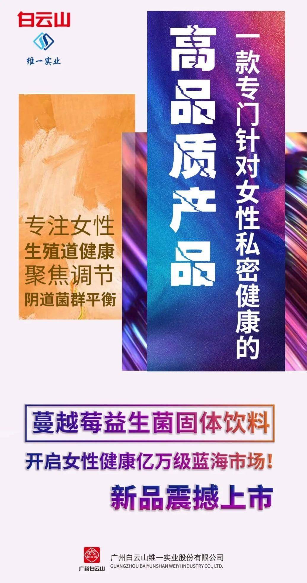 据蔓越莓益生菌固体饮料包装上的信息,产品出品方为广州白云山维一实业股份有限公司(以下简称“白云山维一实业”)。据白云山维一实业官网及官方微信号显示的信息,该产品的主要成分为鼠李唐乳杆菌GR-1,罗伊氏乳酸杆菌RC-14,是一款“专为女性设计的益生菌”,主打“调节体内酸碱平衡、帮助抑制病菌繁殖、提升女性私密处抵御力”。