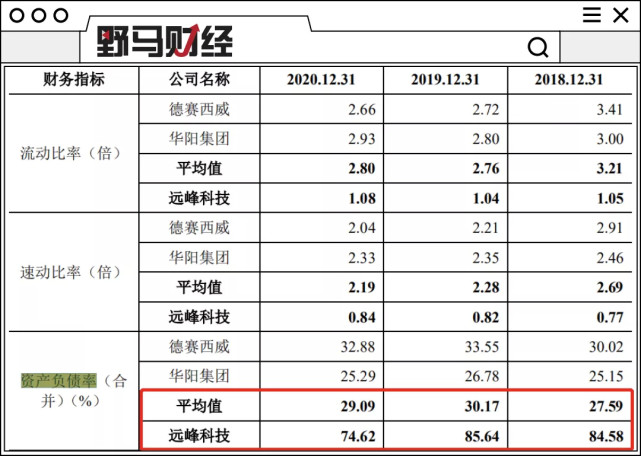 2018年-2020年,远峰科技合并资产负债率分别为84.58%、85.65%和74.62%;仅远峰科技本身的资产负债率就分别达83.34%、85.87%和76.27%。