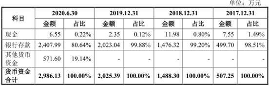 同期,公司货币资金余额分别为507.25万元、1488.30万元、2025.39万元和2986.13万元,占流动资产的比例分别为8.84%、13.99%、10.21%和12.25%。