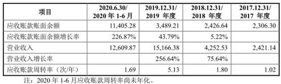 报告期内,公司应收账款账面余额增长率分别为5.22%、43.79%、226.87%。2020年上半年,应收账款大增。