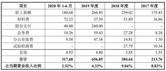 报告期内,研发人员职工薪酬分别为175.43万元、259.02万元、266.85万元和180.68万元,是公司研发费用的主要构成项目。