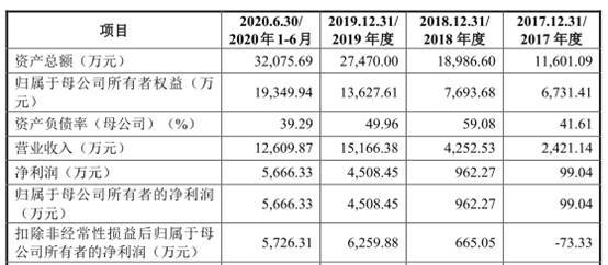 2017年至2020年1-6月,天微电子实现营业收入分别为2421.14万元、4252.53万元、1.52亿元、1.26亿元,其中,主营业务收入分别为2414.64万元、4248.36万元、1.51亿元、1.25亿元。报告期内,公司实现归属于母公司所有者的净利润分别为99.04万元、962.27万元、4508.45万元、5666.33万元。