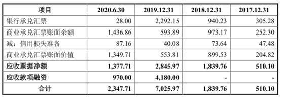 据招股书,由于公司客户采取汇票付款的金额逐步增加,导致公司应收票据总体呈上升趋势。2020年6月末应收票据余额大幅减少,主要原因为2020年1-6月公司贴现了部分票据,另一方面公司主要客户通常集中在下半年回款,导致2020年6月末应收票据余额较少,而应收账款增长较大。