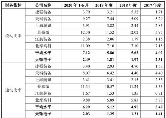 报告期内,天微电子合并资产负债率分别为41.98%、59.48%、50.39%、39.67%,高于同行业上市公司平均资产负债率,同行业上市公司平均资产负债率分别为36.67%、26.28%、23.63%、20.99%。天微电子流动比率、速动比率低于同行业上市公司。