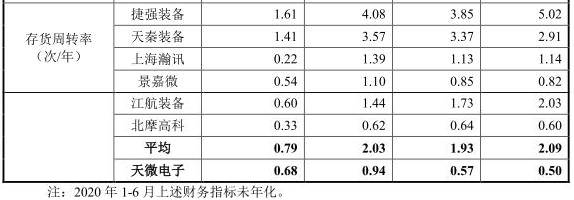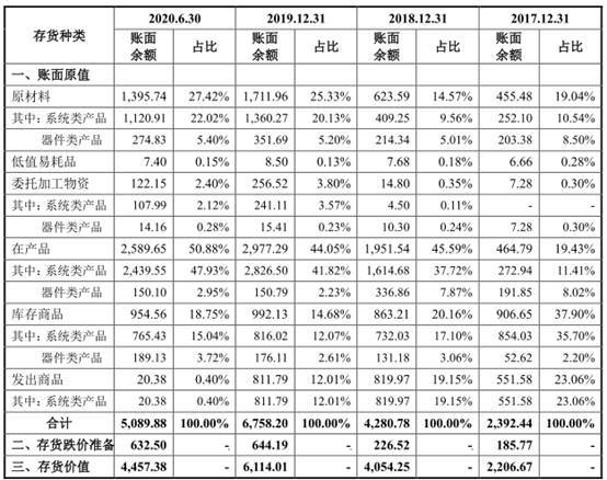 2017年至2020年6月30日,天微电子存货金额分别为2206.67万元、4054.25万元、6114.01万元和4457.38万元,占流动资产的比例分别为38.45%、38.12%、30.81%和18.29%。