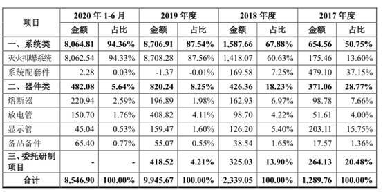 招股书显示,报告期内,公司主营业务毛利率分别为53.41%、55.06%、65.73%和68.14%,呈逐年上升,特别是2019年,较上年度上升了10.67个百分点,主要是毛利率较高的灭火抑爆系统产品收入占比持续增加,2020年1-6月其收入占比达到了94.03%,另外器件类产品毛利率随着销量的提升而稳步增长。