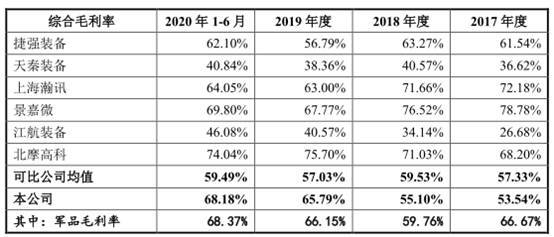 公司2017年和2018年毛利率略低于可比上市公司平均水平,2019年和2020年1-6月略高于可比上市公司平均水平。招股书称,主要原因为2017年和2018年毛利率相对较低的民品收入占比相对较高,2019年以来公司军用灭火抑爆系统产品收入大幅提高,军品占比较高,导致毛利率大幅提高。