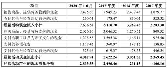 2017年至2020年6月30日,公司经营活动产生的现金流量净额分别为-166.16万元、231.15万元、2496.46万元、2833.55万元。2017年至2020年6月30日,公司经营活动产生的现金流量净额分别为-166.16万元、231.15万元、2496.46万元、2833.55万元。