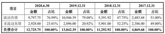 报告期内,公司负债总额分别为4869.68万元、1.13亿元、1.38亿元、1.27亿元。其中,流动负债金额分别为2483.68万元、5391.92万元、1.09亿元、9797.75万元。