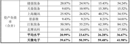 报告期内,天微电子合并资产负债率分别为41.98%、59.48%、50.39%、39.67%,仅在可比公司江航装备之下,高于同行业上市公司平均资产负债率,同行业上市公司平均资产负债率分别为36.67%、26.28%、23.63%、20.99%。